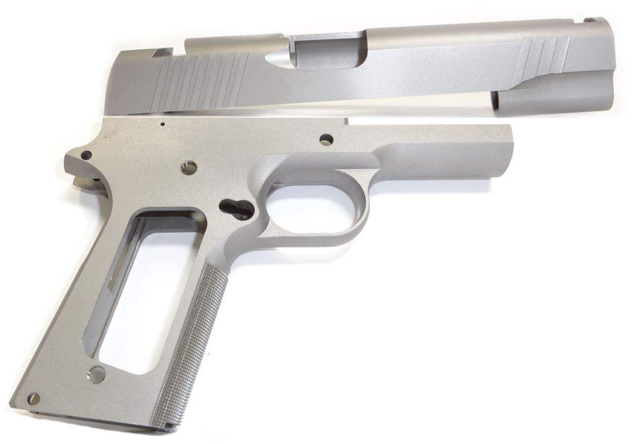 Loading... Please wait...Frame is forged 4140 Carbon steel. Slide is 416r Stainless Steel This is a not an FFL item. This is not a complete frame and still requires machining to be done. 4 Operations left to be completed are Decking the top (must do first) Slide rails hammer hole sear pin holes Beavertail safety fitting (personal preference) Kit does not come with sights or a magazine. Parts list includes Forged frame is 4140 Steel series 70 with 30 LPI checkered grip. Forged slide is 416r Stainless Steel ready to install. Slide is cut for Novak sights. Firing pin hole is .095 will not work on 9mm and up